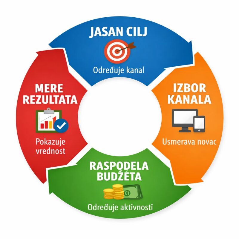 Prvo definišete šta tačno želite da postignete (prodaju, lead-ove, vidljivost), zatim birate kanale koji realno mogu da doprinesu tom cilju, a tek onda raspoređujete budžet prema tome gde očekujete rezultat. Na kraju, sve to merite kroz jasno postavljene metrike.
